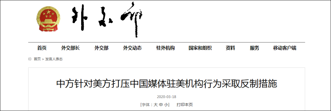 中方第一時間就美方錯誤做法向美方提出嚴正交涉,表達堅決反對和強烈譴責,並強調保留做出反應和採取措施的權利。中國對美方無理打壓中國媒體駐美機構的行為,進行了必要的對等反制和正當的合理防衞。在此背景之下,一些外國媒體及其記者選擇“遷出”中國大陸。