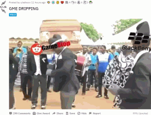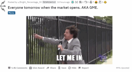 一邊不顧一切瘋狂購買GameStop股票,另一邊,論壇裏的人還熱衷製造梗圖,通過具有煽動力的詞語來調動大家的情緒,並分享自己的大漲與大跌的成果。