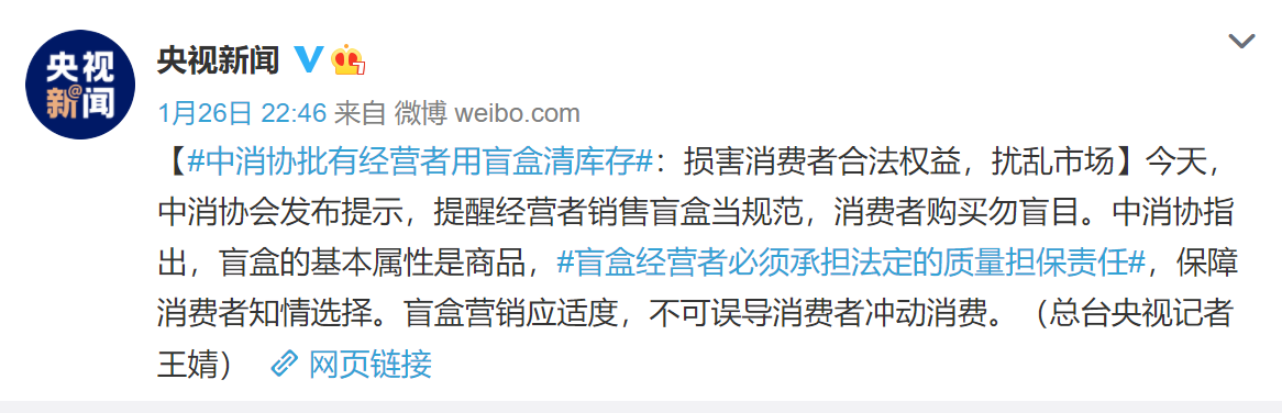 據央視總枱1月27日報道稱,中消協會發布提示,提醒經營者銷售盲盒當規範,消費者購買勿盲目。