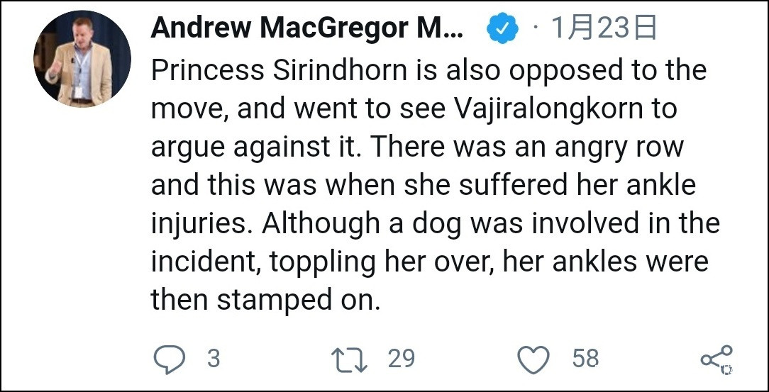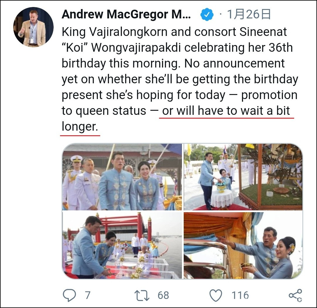 據瞭解,安德魯曾任路透社曼谷分社的社長,關注泰國王室多年。此前,詩妮娜出獄及恢復頭銜的消息也是最早由安德魯在社交網站上曝光的,因此他的爆料得到了英國《每日郵報》、德國《圖片報》和美國《每日野獸》等媒體的轉載報道。