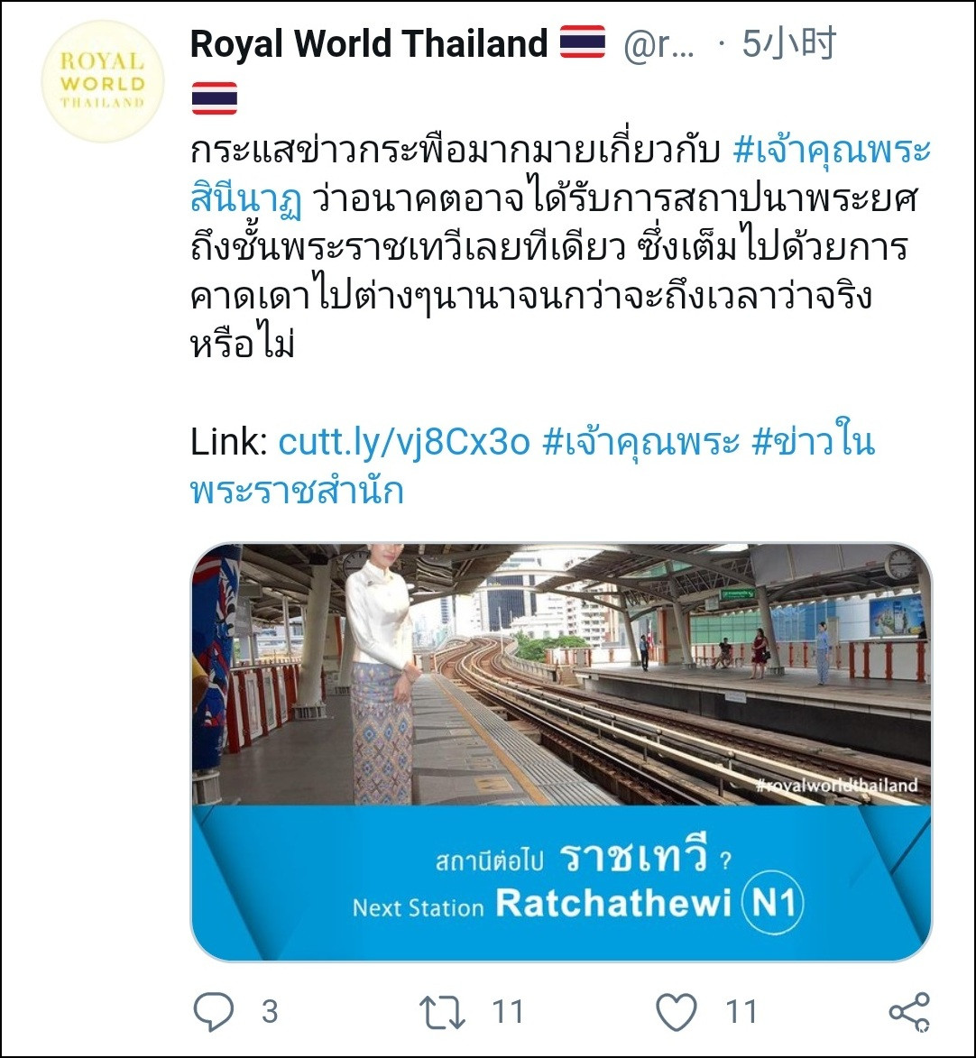 泰國媒體《皇家世界》27日下午在社交網站上發文稱,泰國王室沒有任何關於詩妮娜冊封的消息,且王室不會對網傳消息做出回應。