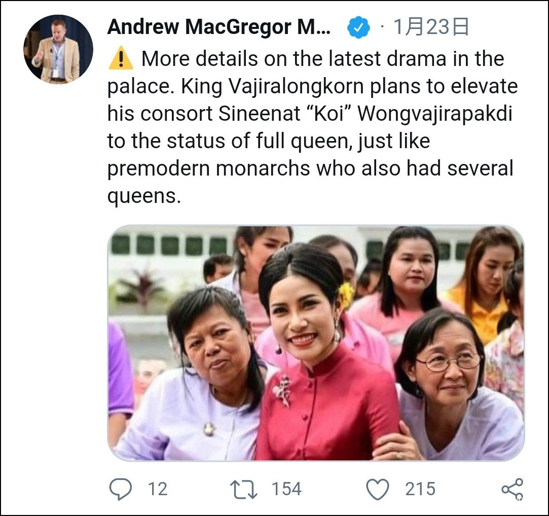23日,英國籍記者安德魯(Andrew MacGregor Marshall)在社交網站上發文稱,得到內幕消息,泰王有意進一步抬高詩妮娜的頭銜。詩妮娜目前是貴妃,如果更進一步抬高頭銜的話,那麼她將被冊封為王后。