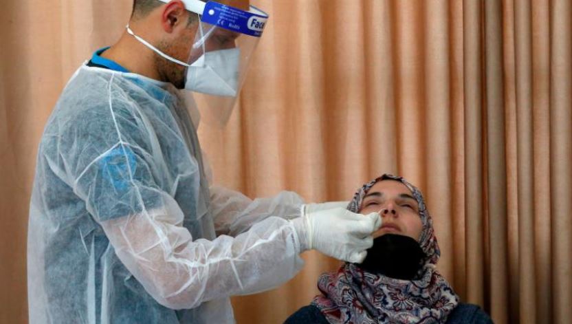 巴勒斯坦醫護人員對一位村民進行新冠檢測