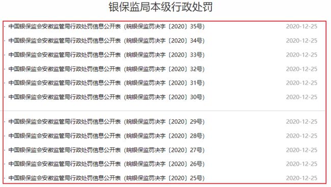 2020年年末,安徽銀保監局一口氣掛出11張罰單,劍指徽商銀行股份有限公司、徽商銀行股份有限公司合肥分行及其相關責任人。其中,徽商銀行被處以罰款290萬元,徽商銀行合肥分行被處以40萬元罰款。