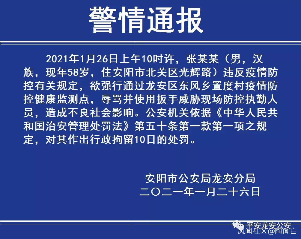 2021年1月26日上午10時許,張某某(男,漢族,現年58歲,住安陽市北關區光輝路)違反疫情防控有關規定,欲強行通過龍安區東風鄉置度村疫情防控健康監測點,辱罵並使用扳手威脅現場防控執勤人員,造成不良社會影響。公安機關依據《中華人民共和國治安管理處罰法》第五十條第一款第一項之規定,對其作出行政拘留10日的處罰。