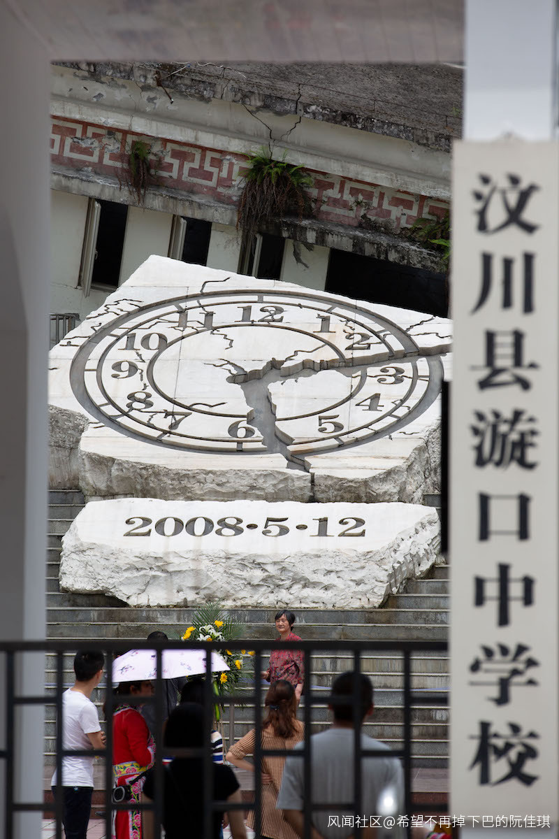 教學樓廢墟前,還安放着一個碩大的四川汶川特大地震紀念錶盤,上面清晰地顯示着地震發生的時間——下午兩點二十八分。