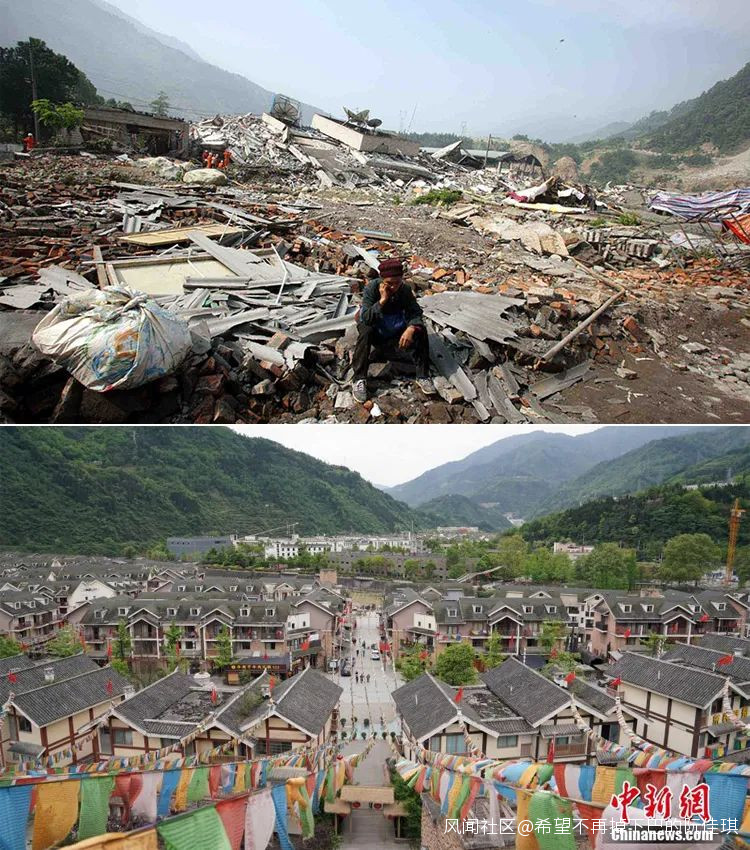 上圖為映秀鎮震後景象,下圖為2018年的映秀鎮 圖自中新社