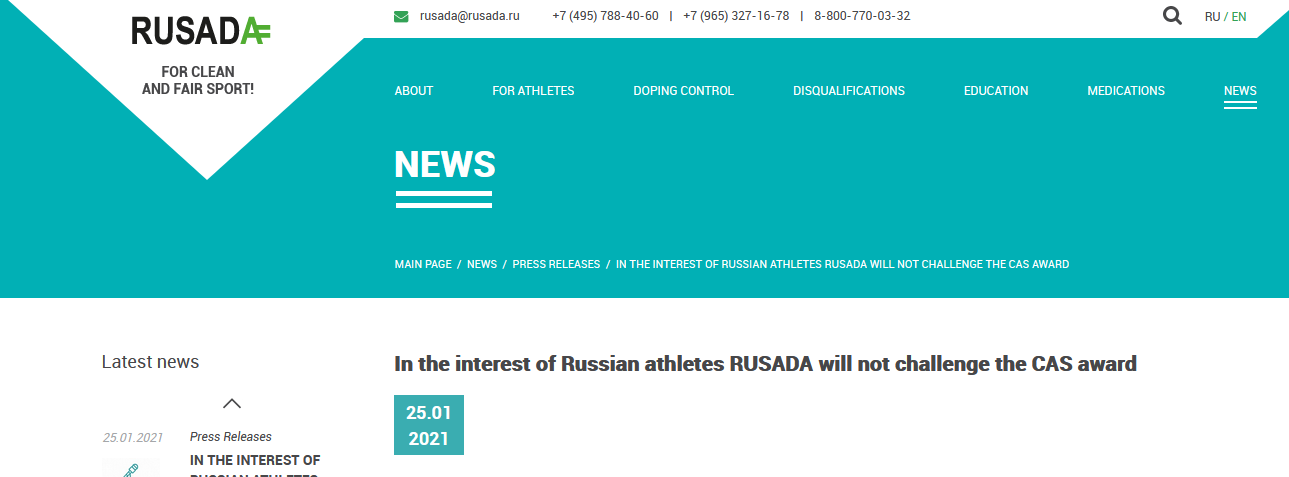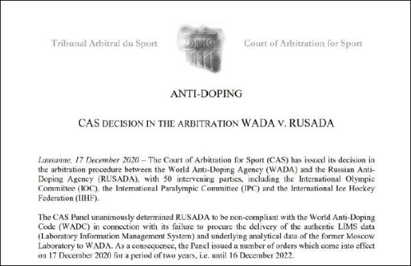 去年12月17日,國際體育仲裁法庭認定RUSADA違規(非法地篡改俄羅斯興奮劑檢測實驗室數據,掩蓋系統性的服用興奮劑行為),對俄羅斯處以為期兩年的一系列處罰。