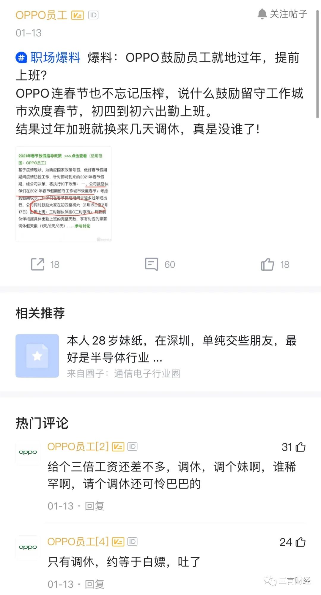 此外,也有網友在網上“訴苦”自己公司沒有就地過年的相關獎勵。一名認證為OPPO員工的網友前不久發文稱,OPPO鼓勵員工原地過年,但是要求初四到初六出勤上班。該員工抱怨稱過年加班只換來幾天調休,十分不開心。