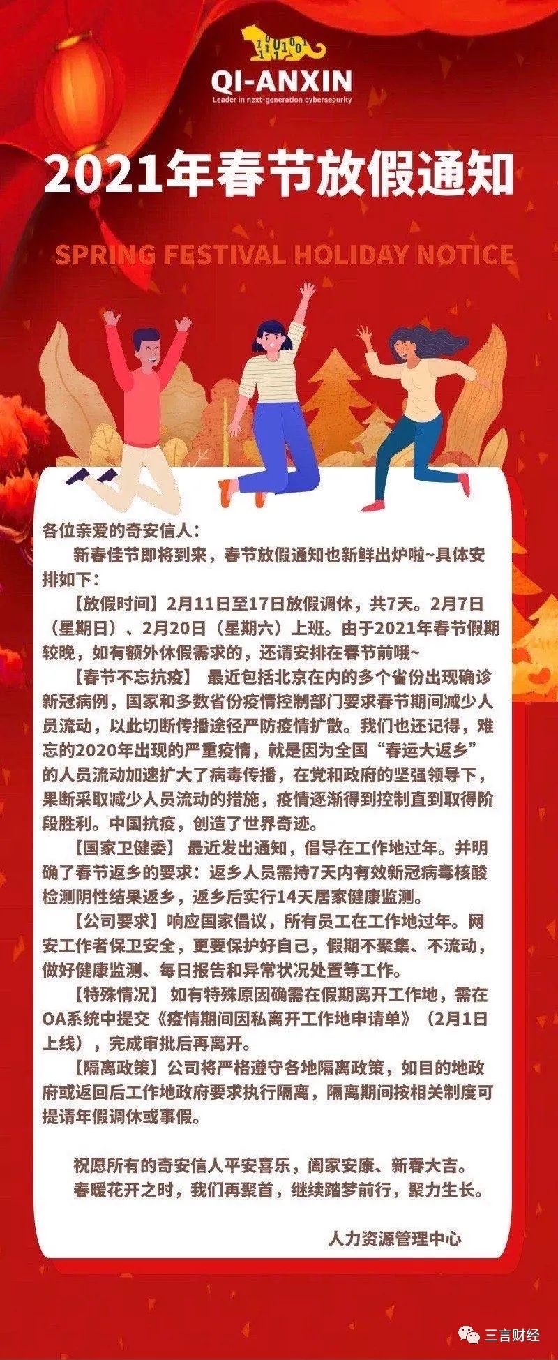 根據網傳奇安信公司春節假期安排通知截圖顯示,奇安信雖然在通知中提倡員工過年不要返鄉,但並沒有提供物質獎勵。