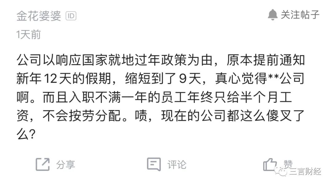 還有網友吐槽自己公司“以響應就地過年政策為由”,將新年12天的假期縮短至9天。此外,入職不滿一年的員工年終獎只給半個月工資。