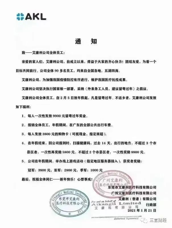 艾康利公司為留在廣東省過年的員工一次性發放9900元過年獎金,此外還贈送價值3800元的購物卡;此外,公司為全體員工在過年期間報銷廣東省內全部公共出行車費。