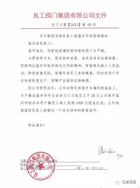 良工閥門集團發佈文件稱,在公司購車獎勵年末福利的基礎上,將為户籍在温州市外且過年期間未離開温州市的非本市户籍員工每人獎勵1000元現金紅包。