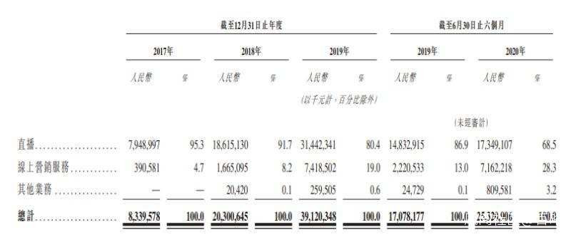 從招股説明書中可以看出,快手將自身收入劃分為三部分:直播、線上營銷服務、其它業務。