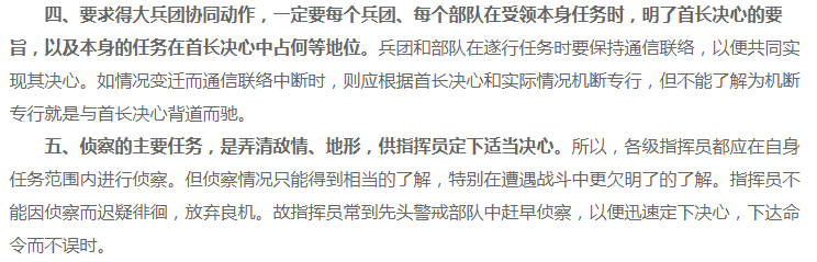 朱德總司令早在1933年發表的《談幾個戰術的基本原則》中就提到,“要求得大兵團協同動作,一定要每個兵團、每個部隊在受領本身任務時,明瞭首長決心的要旨,以及本身的任務在首長決心中佔何等地位。”並且“如情況變遷而通信聯絡中斷時,則應根據首長決心和實際情況機斷專行,但不能瞭解為機斷專行就是與首長決心背道而馳。”