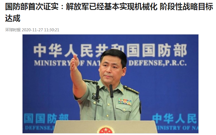 2020年11月26日,國防部新聞發言人任國強大校透露,解放軍已經基本實現機械化,信息化建設也已取得重大進展。這是國防部首次對此消息給予證實,預示着中國國防和軍隊建設的階段性戰略目標已經達成。