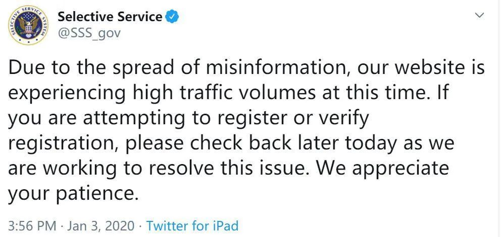 網站之所以崩潰,不是因為大量美國青年踴躍參軍,想要保家衞國。恰恰相反,這些美國民眾是害怕美國和伊朗開戰,自己被強制徵兵,所以趕緊查一下自己有沒有被徵召入伍。