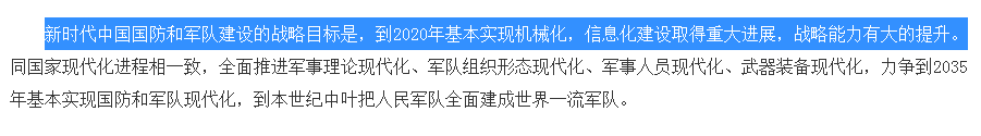 2019年《新時代的中國國防》白皮書提出:“新時代中國國防和軍隊建設的戰略目標是,到2020年基本實現機械化,信息化建設取得重大進展,戰略能力有大的提升。”