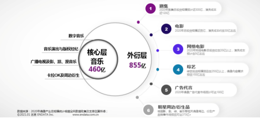 根據藝恩發佈的《2020年中國偶像產業發展報告》,2020年中國偶像產業總規模或超1300億,覆蓋了核心層音樂460億和外衍層劇集、電影、網絡電影、綜藝、廣告代言以及明星周邊/衍生品在內的各大領域855億規模。
