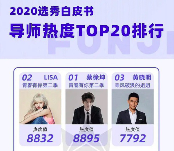《青春有你2》引入的全球偶像Lisa,是一次頗為成功的嘗試。FUNJI發佈的《2020選秀白皮書導師熱度TOP20排行》中,Lisa以8832的熱度值僅次於蔡徐坤的8895,位居第二名,斷層超越第三名的黃曉明。與此同時,YouTube上播放量最高的四支視頻中,Lisa的主題曲練習室、指導訓練生cut、導師個人秀強勢佔據三席。在《青春有你3》中Lisa也將再次迴歸。
