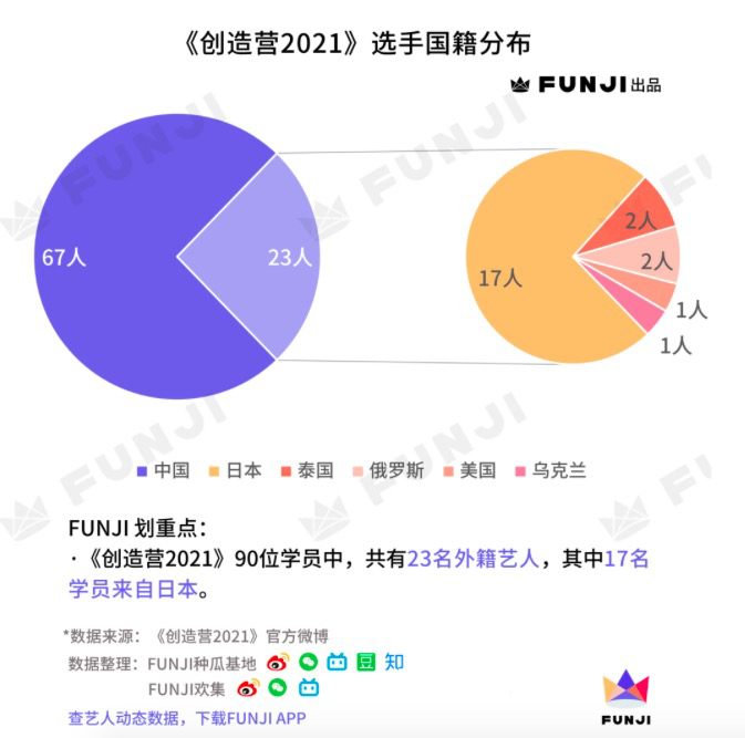 從其日前公佈的學員名單來看,90位的學員數量較之往年有所減少,出道位也是未知數,不過據媒體統計來看,外籍選手佔據了23位,比重達到25%左右,其中日本學員最多共有17名,其餘6名分別來自泰國、俄羅斯、美國和烏克蘭,極大程度豐富了選手的組成和多樣性。