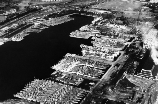 必須得承認,美國的造船能力很強。作為二戰海軍**“下餃子”**的範例,僅一個費城海軍造船廠,幾年內就建造了26艘大型航母、9艘輕型航母和115艘護航航母,另外還有幾十艘巡航艦、幾百艘驅逐艦和幾萬艘登陸艦艇。