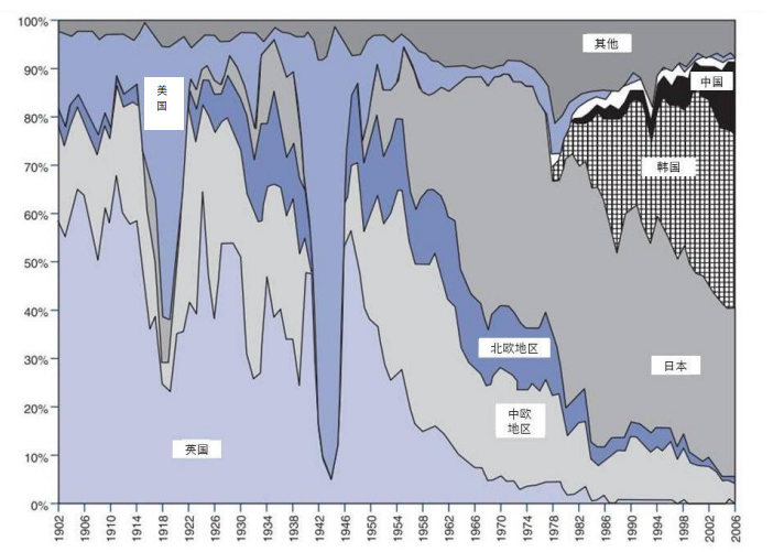整個20世紀全球船舶工業的變遷,上面這張圖能看得很清楚。最開始是英國一家獨大,後來歐洲國家和日本崛起,再後來韓國橫空殺出,在世紀末形成日韓雙雄並立的局面。你也許會問,美國去哪了?美國造船能力不強嗎?