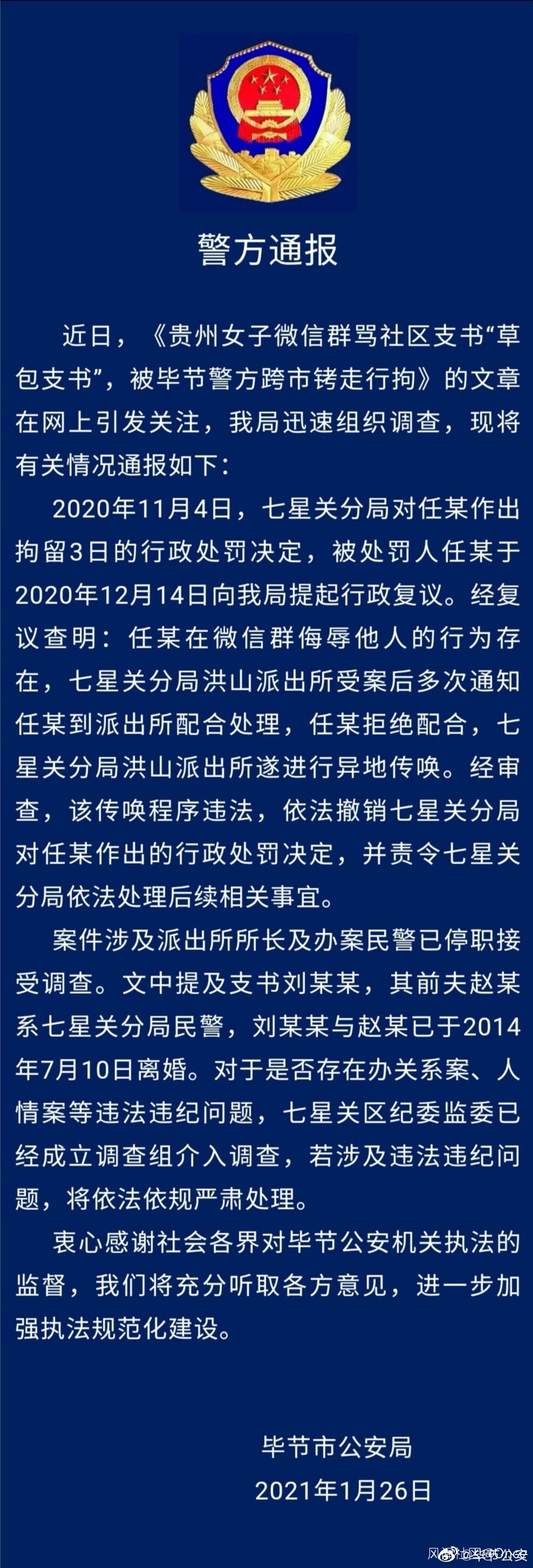 事情引發關注後,2021年1月26日,貴州省畢節市公安局官方微博@畢節公安 發佈通報,經審查,傳喚程序違法,依法撤銷七星關分局對任某作出的行政處罰決定,並責令七星關分局依法處理後續事宜。案件涉及派出所所長及辦案民警已停職接受調查。