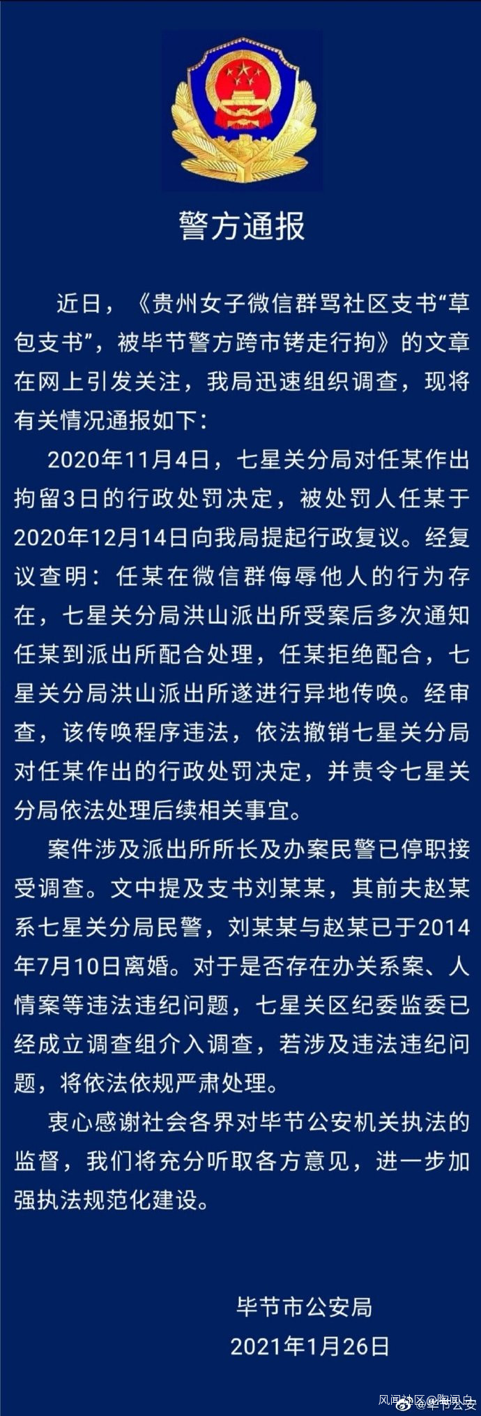 貴州省畢節市公安局官方微博(@畢節公安)1月26日發佈通報稱,近日,《貴州女子微信羣罵社區支書“草包支書”,被畢節警方跨市銬走行拘》的文章在網上引發關注,畢節市公安局迅速組織調查,現將有關情況通報如下:
