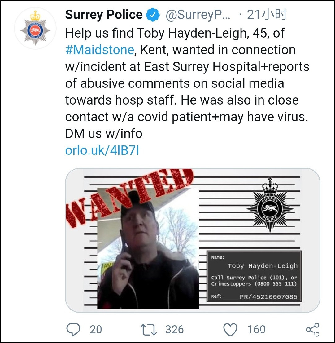 目前,薩里郡警方已經發布通報,希望市民可以提供與涉事男子相關的線索。