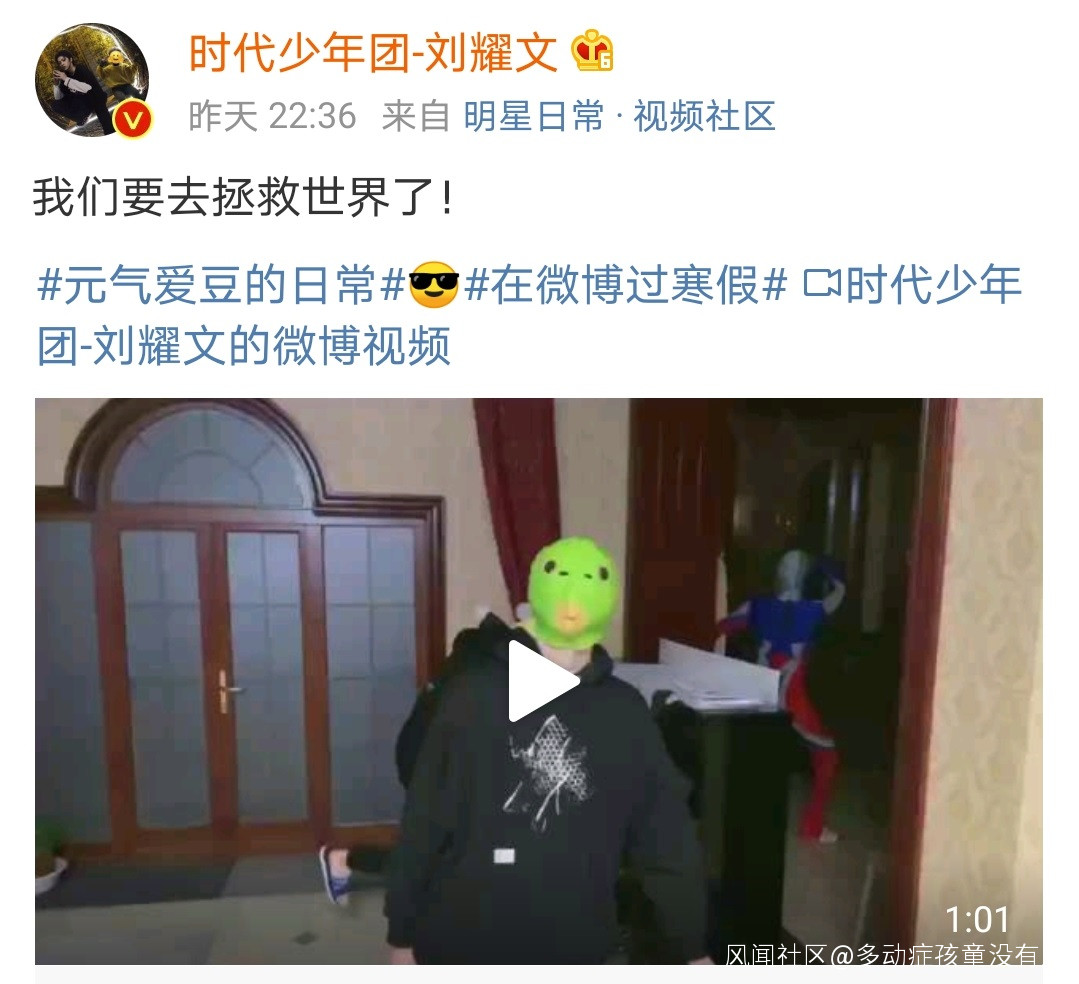 1月27日,時代少年團成員劉耀文在微博上發佈了一則展現生活日常的視頻。