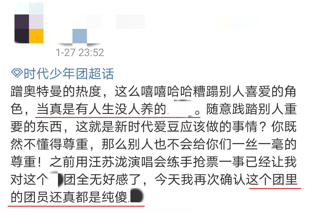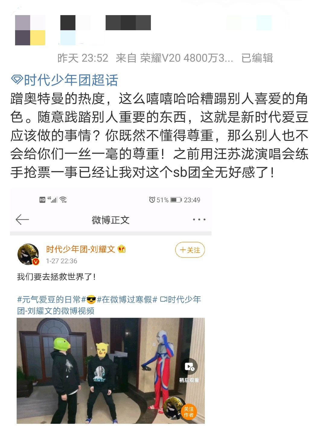 大致意思是説,時代少年團的成員在蹭奧特曼的熱度,隨意糟蹋別人喜愛的角色,對於別人的興趣愛好不夠尊重。