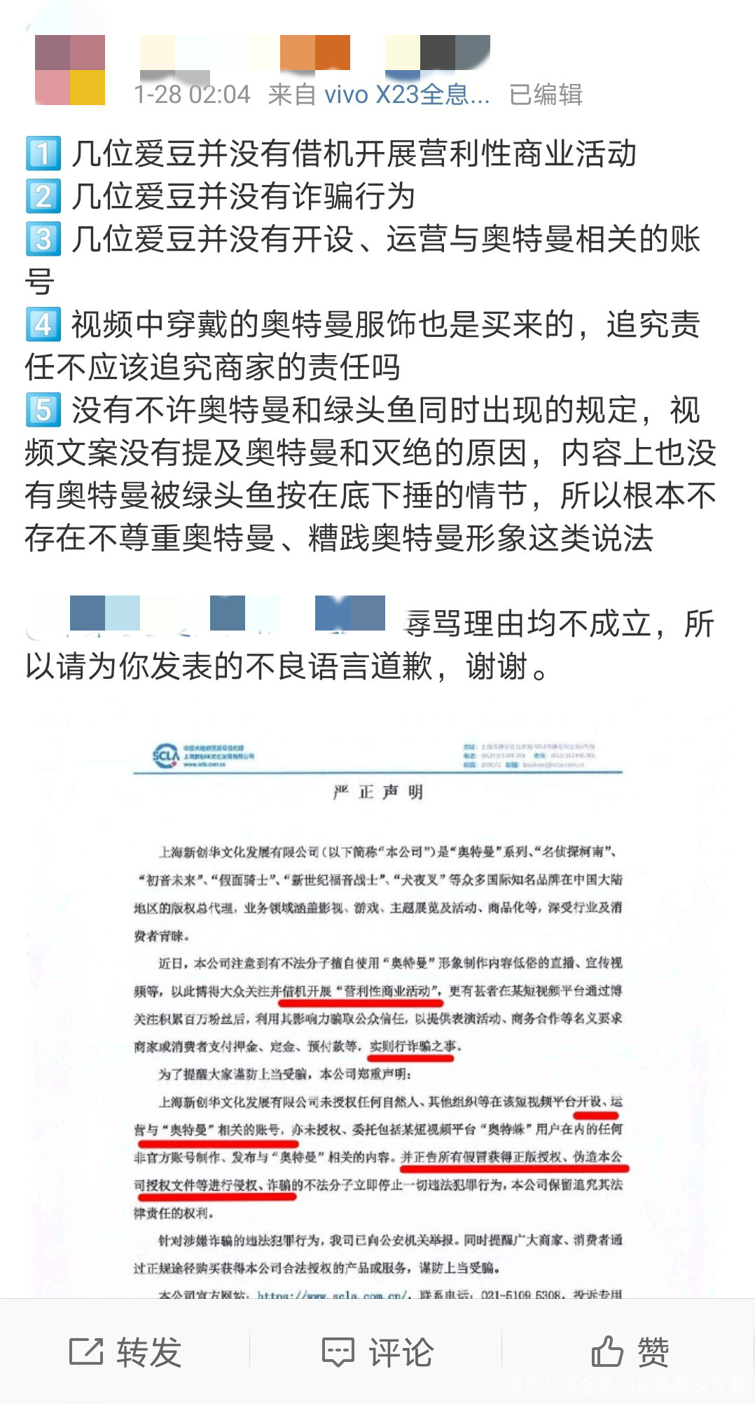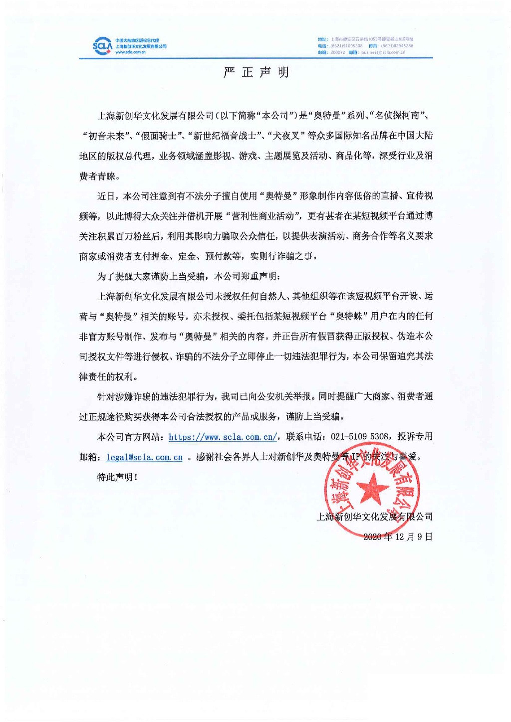 當時,上海新創華文化發展有限公司發表聲明,稱他們注意到有不法分子擅自使用“奧特曼”形象製作內容低俗的直播、宣傳視頻等,以此博得大眾關注並藉機開展營利性商業活動,更有甚者在短視頻平台通過關注積累百萬粉絲後,利用自身影響力進行詐騙。