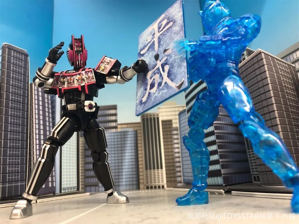 通過變更貼紙、搭配假面騎士掌動X系列 最終形態玩偶,還原帝騎完全形態召喚其他平成假面騎士一起戰鬥的情節!