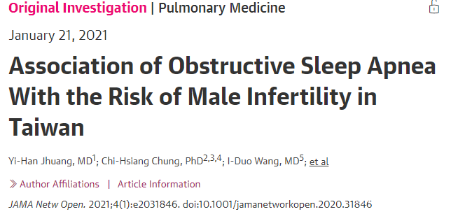 1.Association of Obstructive Sleep Apnea With the Risk of Male Infertility in Taiwan.JAMA Netw Open. 2021;4(1):e2031846. doi:10.1001/jamanetworkopen.2020.31846