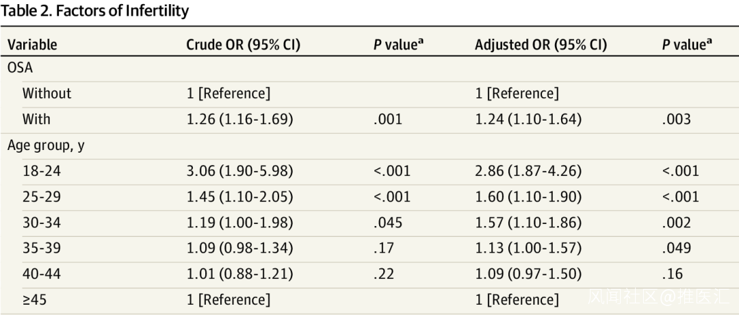 分析結果顯示,阻塞性睡眠呼吸暫停(OSA)與代謝、神經認知功能具有相關性。它表現為睡眠時,咽部反覆塌陷產生間歇性、呼吸停止,即俗稱的“打呼嚕”。而就不育看,OSA與其有着顯著相關性。相比對照組,OSA患者的不育風險要高1.24倍。研究人員定義OSA,是通過多導睡眠圖監測、確診,至少進行3次門診就診或1次住院治療。