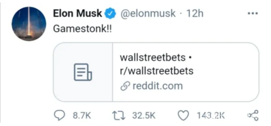美國當地時間週二,世界首富馬斯克發佈了一條推特,高呼“Gamestonk!”,並附帶了一個指向WallStreetBets板塊的鏈接。