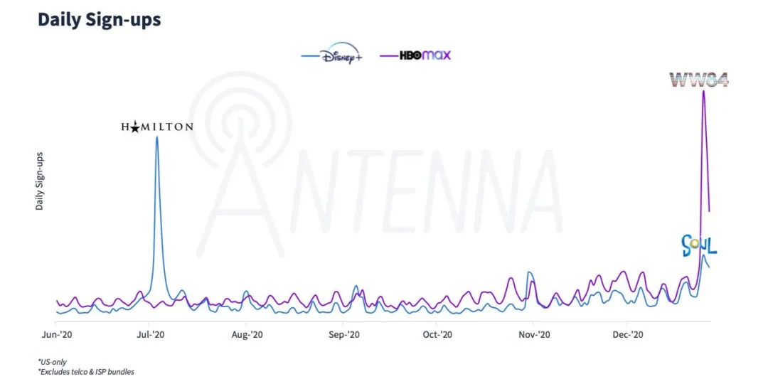 最近的第三方數據顯示,《神奇女俠1984》和《漢密爾頓》的流媒體發行都推動了大批新用户進入兩家的流媒體平台。研究公司 Antenna 的最新數據提到,在今年諸多流媒體首映的好萊塢電影中,超英續集《神奇女俠1984》和著名音樂劇電影《漢密爾頓》所拉動的新增註冊人數佔據了榜單前兩位。