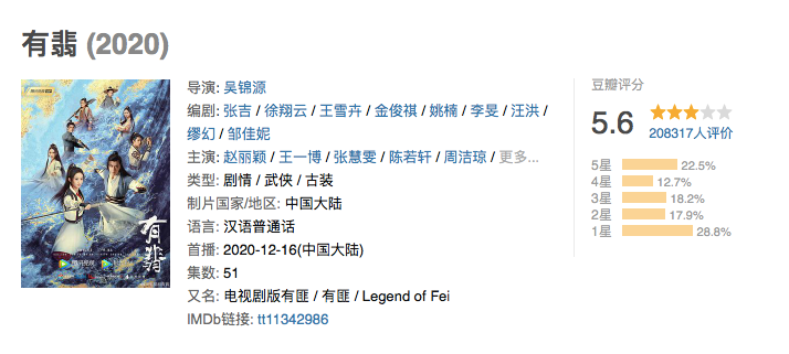 騰訊視頻“天價劇”《有翡》豆瓣評分