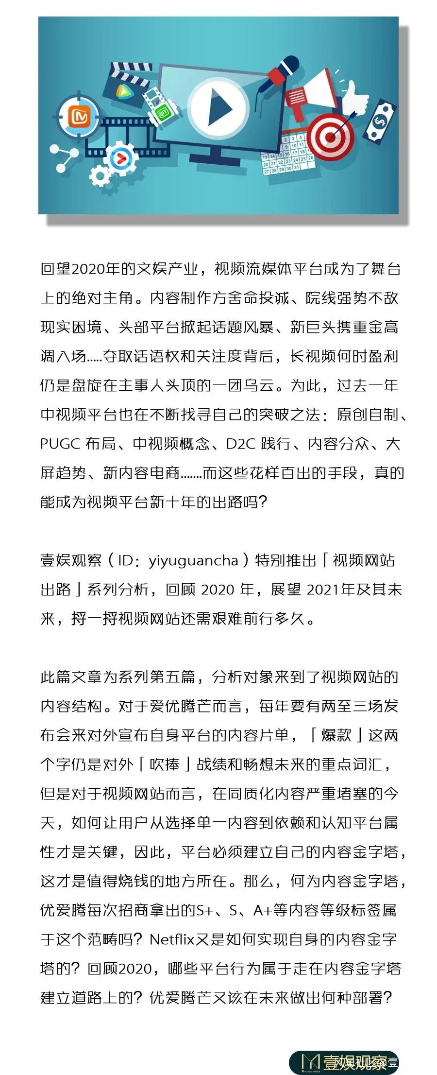 因此,對於優愛騰芒而言,未來幾年的重任,不再是爆款追逐者,而是下決心要去做平台性內容金字塔的搭建者,這兒的內容金字塔,並不是簡單如平台方過往的慣例操作,按照IP大小、明星量級等方面對投入資源和資金量進行劃分,對外招商時給平台作品劃出S+、S、A+、A、B等這樣的字母等級。所謂內容金字塔,要以絕大多數自制內容達到及格線作品為準則,然後一小部分加入金牌的製作團隊去在創作上花更多心思,在此基礎上,真正意義上的話題大作、出圈作品一年以內也是屈指可數的。
