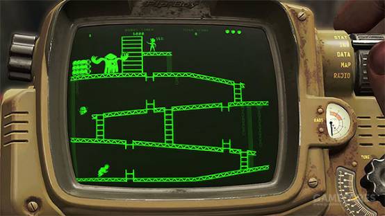這樣的設定,我們在《輻射4》中也可以看到:便攜遊戲機pip-boy可以讓玩家玩《大金剛》等小遊戲,pip-boy人氣之高甚至讓開發商真的去做了一款周邊商品來出售。