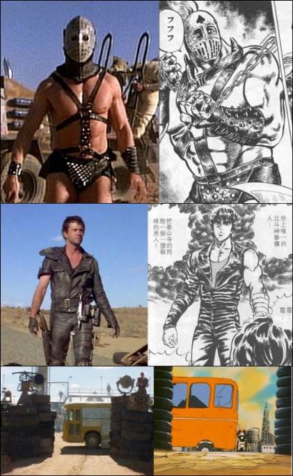 《北斗神拳》不僅沿用了《瘋狂麥克斯》的末世世界觀設定,在人物形象設計乃至畫面結構的細節上,也可以看到後者對它的濃重影響。