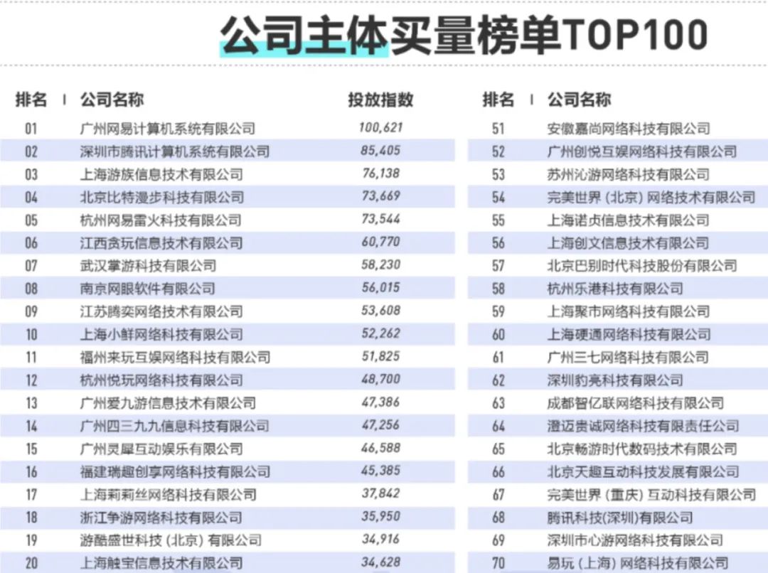 在2020年,不斷入場的頭部公司幾乎奪走了流量市場的半壁江山。據DataEye數據研究院統計,這一年當中買量最兇的公司主體Top 2是網易和騰訊,遊族、靈犀、莉莉絲、完美世界等公司也榜上有名。