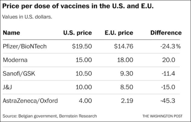 部分疫苗歐盟和美國獲取價格對比 圖源華盛頓郵報