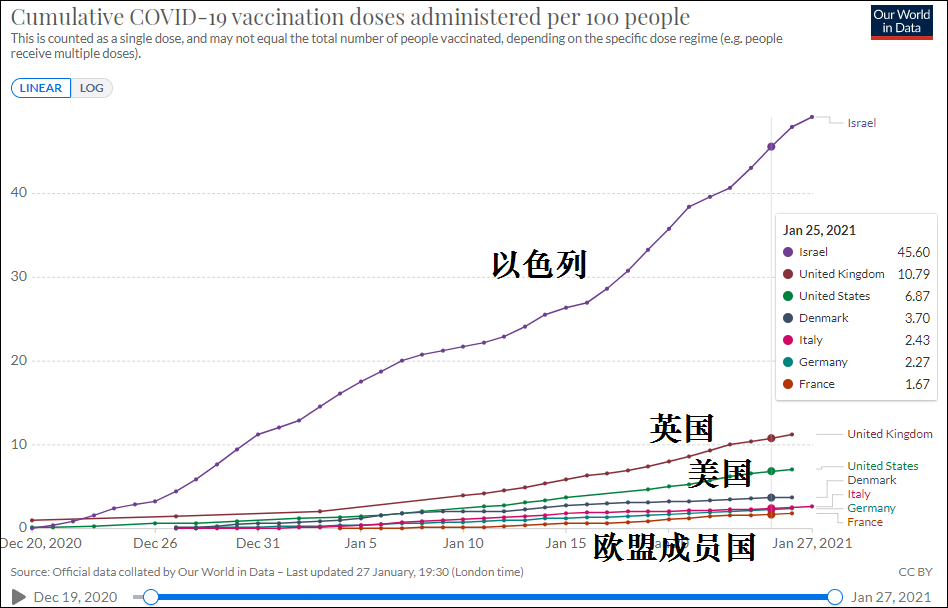 歐盟的處境則更加艱難,數字顯示,它的疫苗接種工程遠遠落後於以色列、英國和美國。在以色列,每100人中有45個人接種了疫苗,這個數字在英國為10人,在美國為6人;在歐盟疫苗接種表現最好的丹麥,這個數字僅為3人。德國和法國更低,法國每100人中接種疫苗的不到2人。