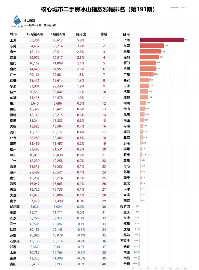 根據70城房價數據,去年12月,杭州新房價格同比增長4.5%,環比還降了0.3%;二手房價格同比上漲6.9%,環比上漲0.5%,都不算特別突出。最新一期的冰山指數排名,杭州房價漲幅排在第10位,低於泉州、合肥、西安、廣州等地。