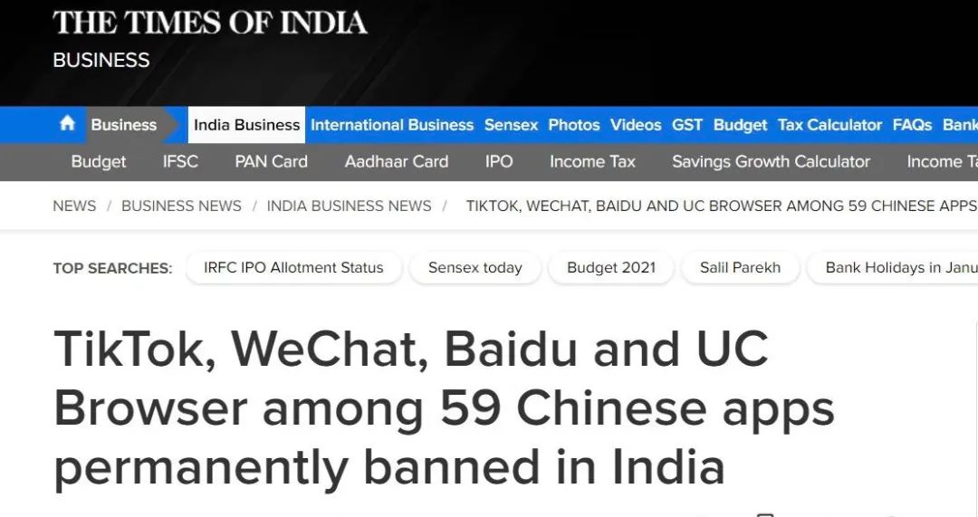 1月26日,《印度時報》發文稱,將在今年6月永久禁止59款中國手機應用程序。