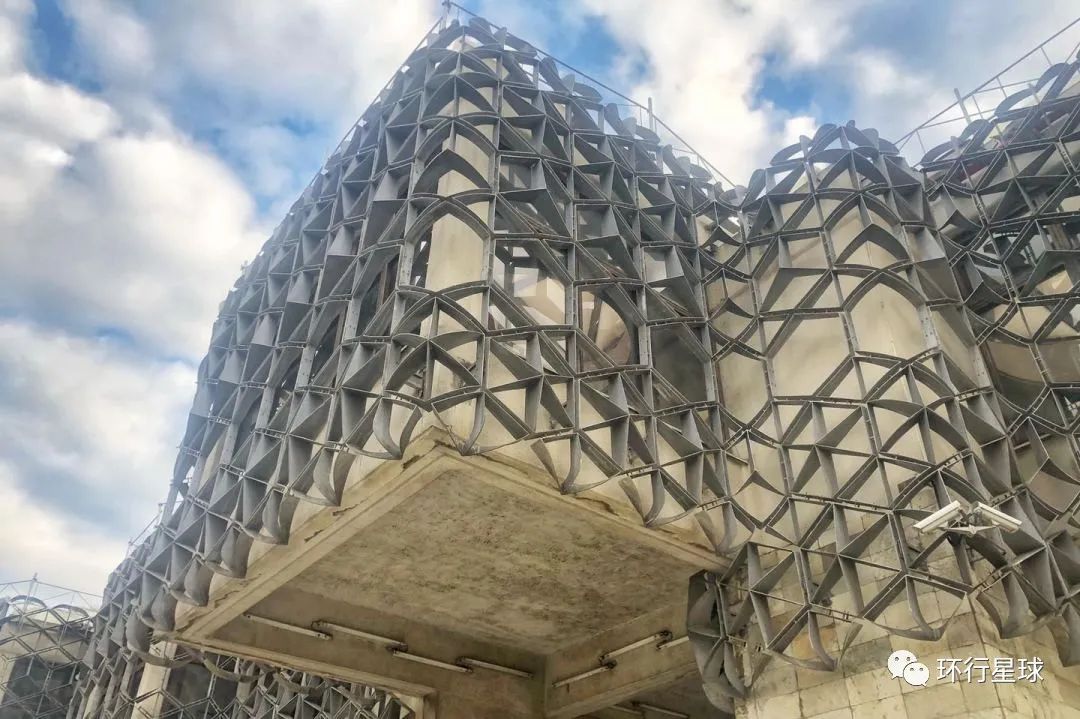 從遠處走來乍一看像監獄,近看那些黑色的不明線條配上屋頂上無數個半圓球體像科幻片裏外星人的實驗室,或者《異次元殺陣》裏的魔方迷宮。