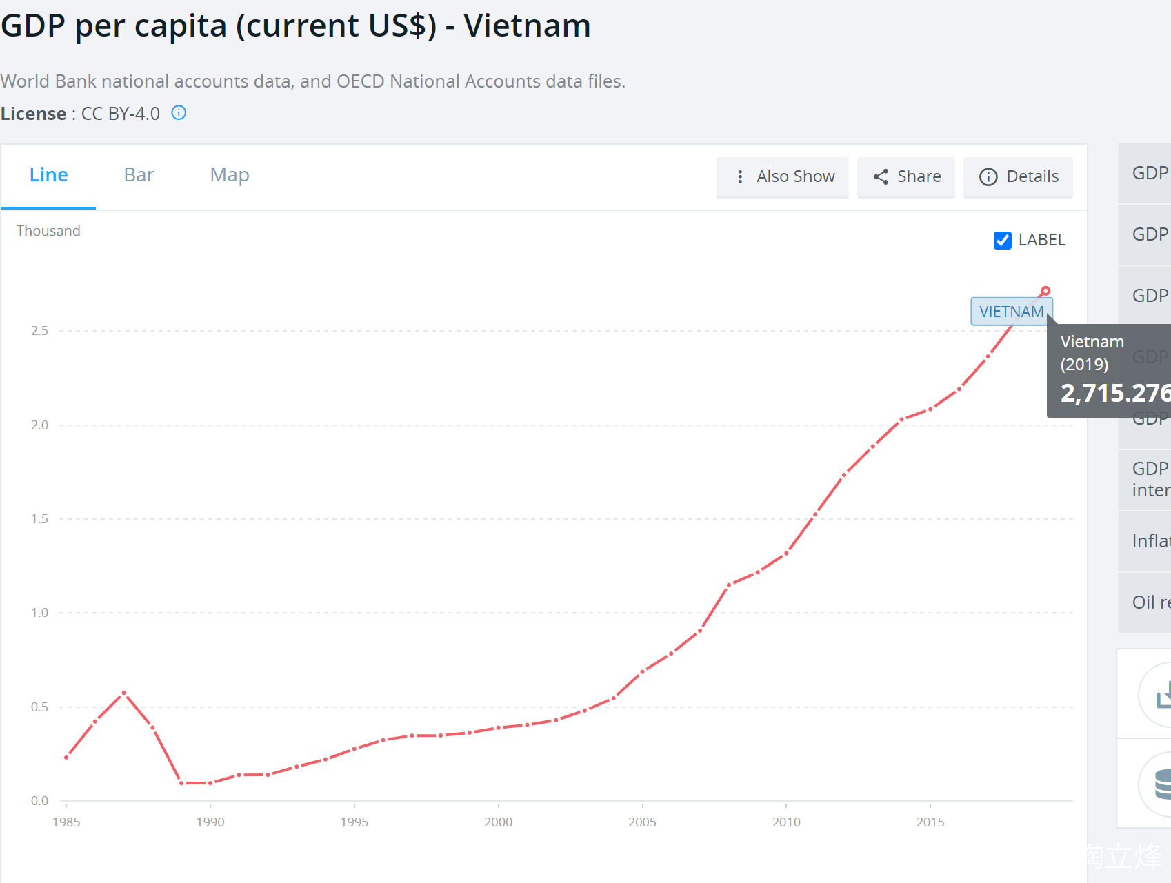 而世界銀行的統計數據,2019年越南人均GDP剛超過2700美元,如果按照6%的增長率連續發展,2030年將達到5130美元,2045年則將達到12285美元。