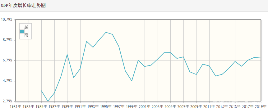 越南的經濟實力在東盟國家中位居中游,也稍遜於我國的廣西壯族自治區。但發展勢頭並不弱,2015年-2019年的GDP增長率均在6%以上,其中2018年2019年兩年均超過7%。